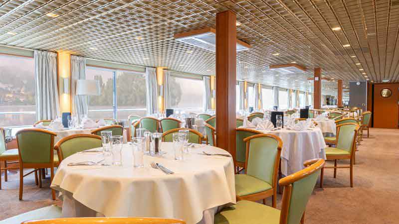 Restaurangen, som ligger på övre däck, erbjuder fransk mat i en trevlig miljö, där stora panoramafönster ger möjlighet att njuta fullt ut av utsikten. På samma däck hittar du även loungen och baren, som har ett dansgolv. På soldäcket kan man njuta av bekväma solstolar och ett rymligt skuggat område.